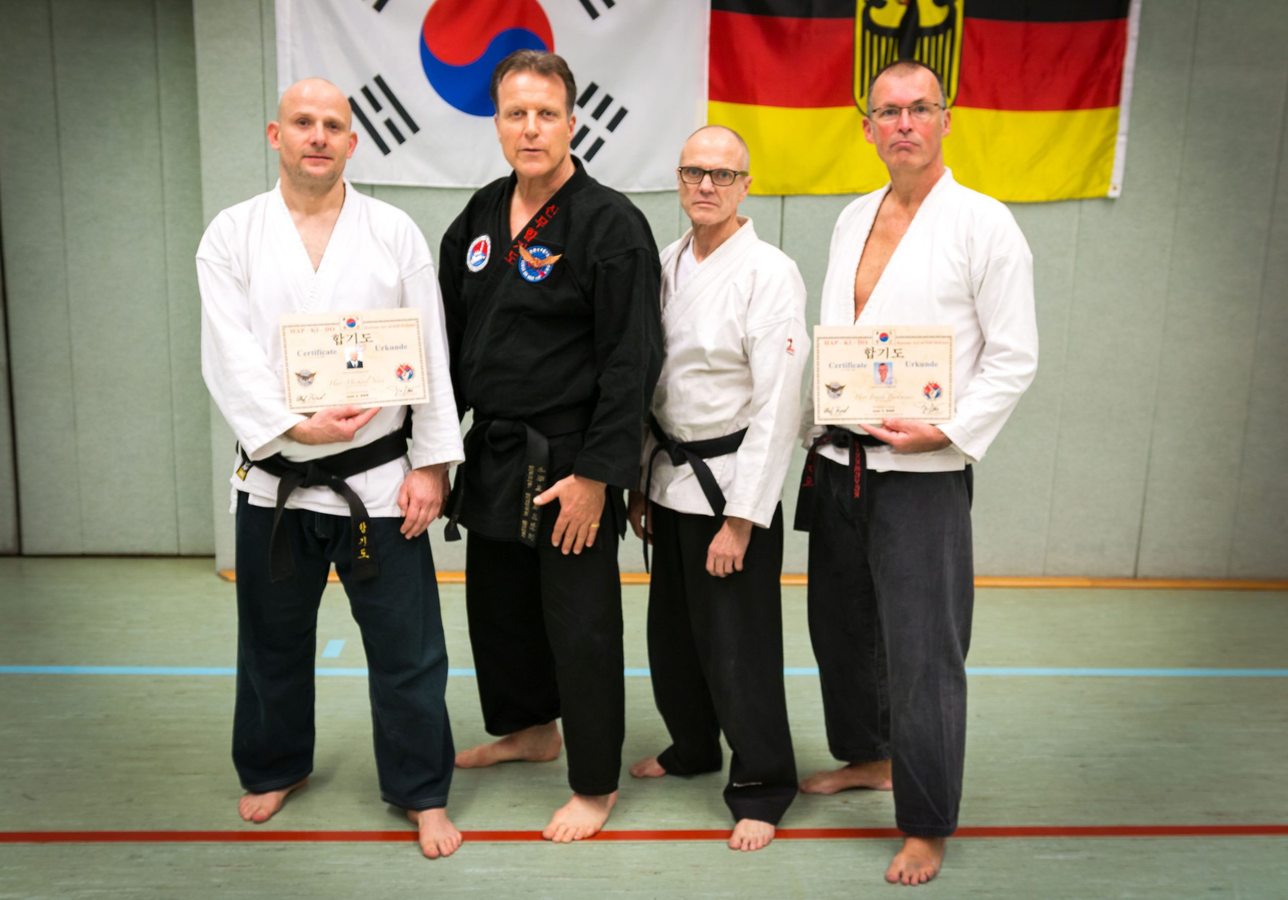 Nach vierstündiger Prüfung konnten der Neu-Isenburger Hap-Ki-Do Meister Michael Nees und sein Offenbacher Kollege Frank Birkmeyer, von Hap-Ki-Do Großmeister Michael Biffar (7. DAN) die verdiente Urkunde zum 3. DAN in Empfang nehmen …